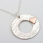 This gorgeous personalised sterling silver heart and disc hammered pendant has either a copper or rose gold heart and can be inscribed on the back with your own personalised message.